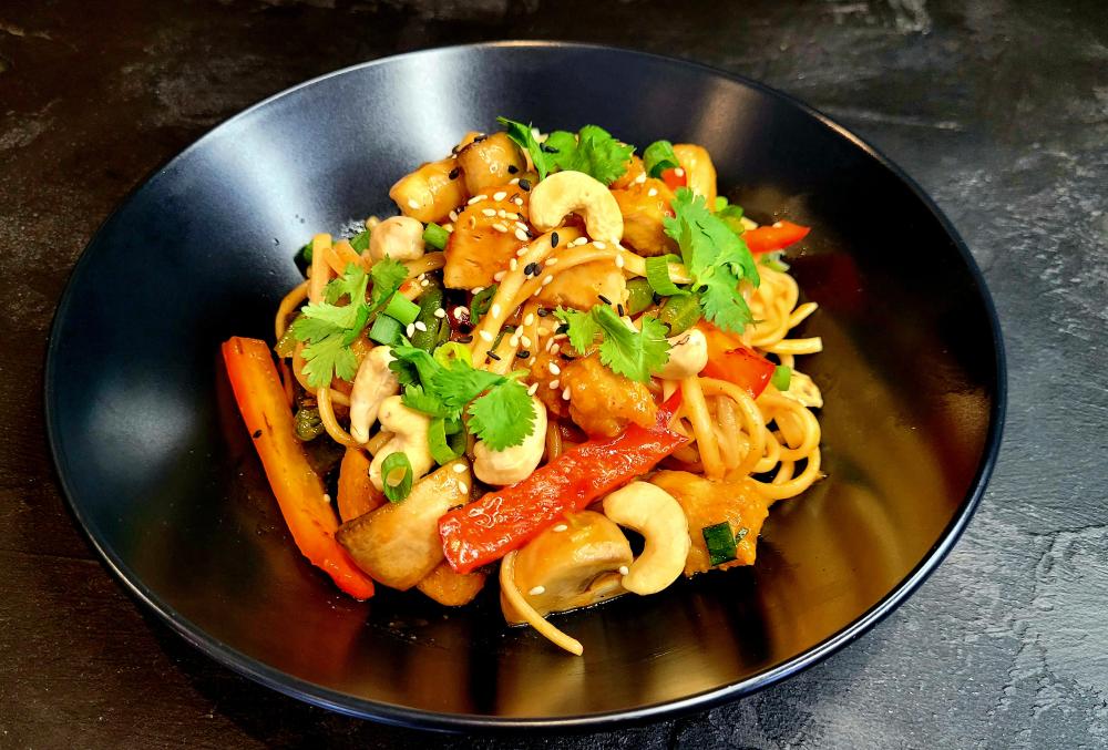 Пшеничная лапша удон, куриное филе в пикатной панировке, шампиньоны, перец болгарский, фасоль зелёная, орехи кешью, сладко острый соус, соус кимчи, соус устричный, кинза, кунжут, лук зелёный.