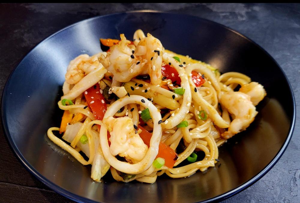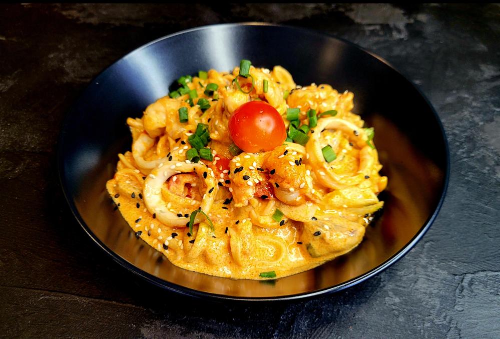 Лапша пшеничная удон, креветки, кальмар, паста острая, сливки, перец болгарский, шампиньоны, черри, кунжут, лук зелёный