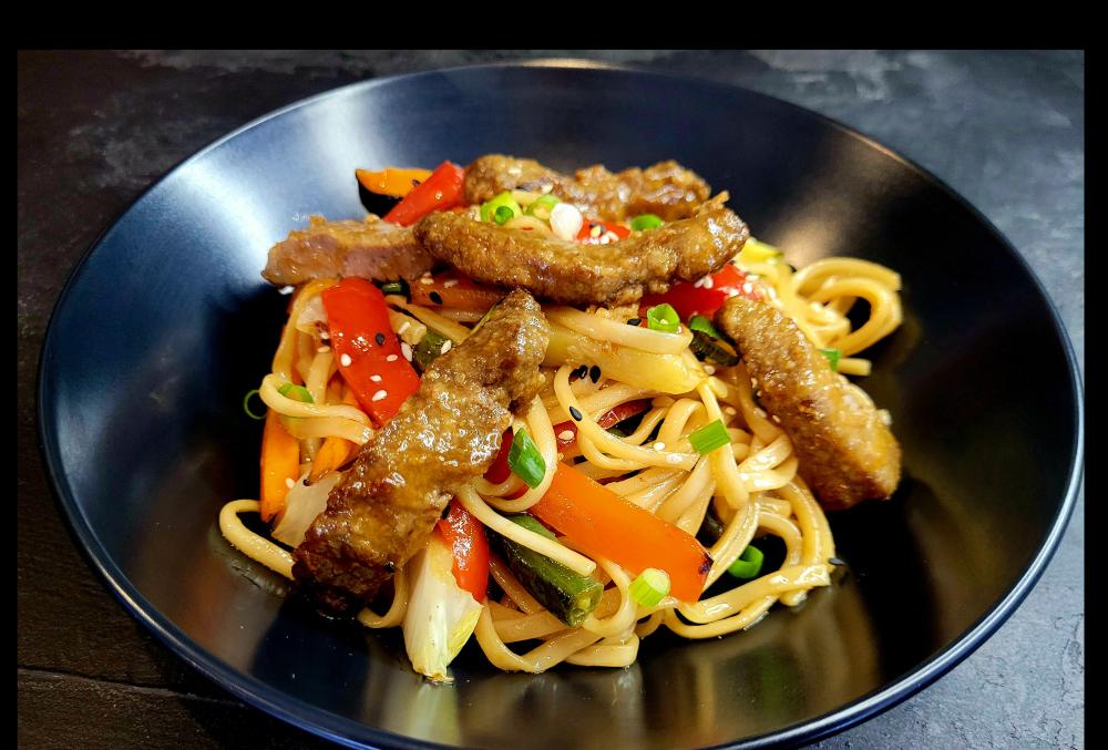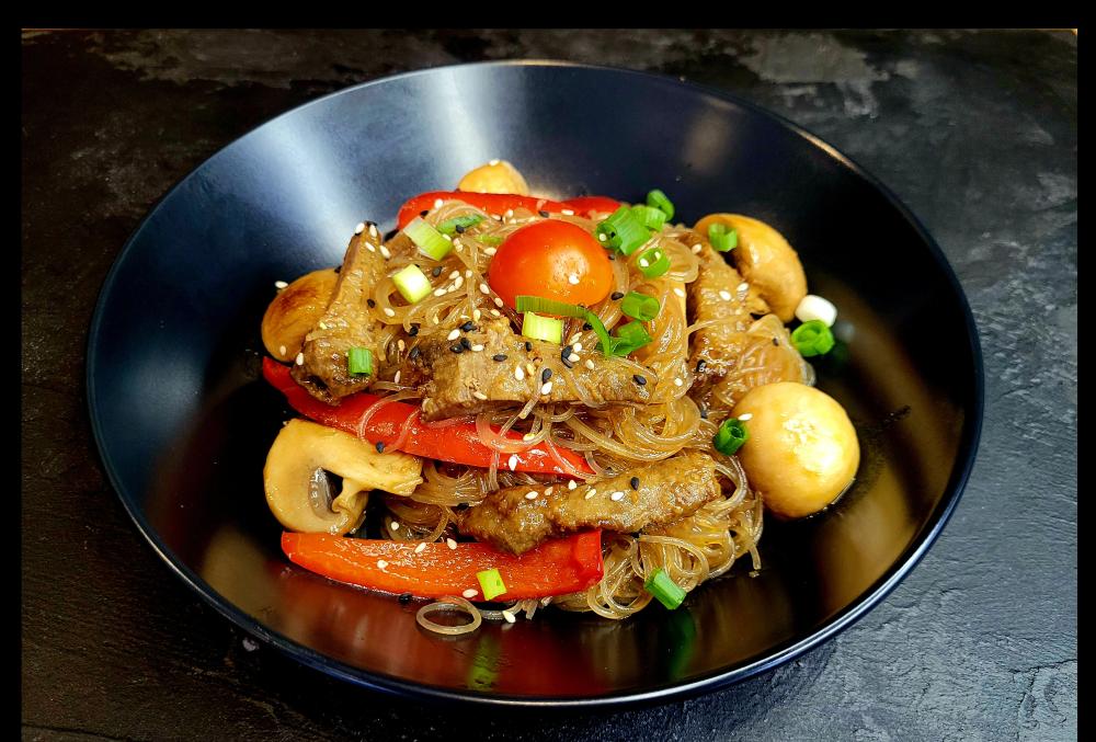 Бобовая лапша, говядина мякоть в пикантной панировке, перец болгарский, шампиньоны, соус терияки, соус фирменный, черри, лук зелёный, кунжут.