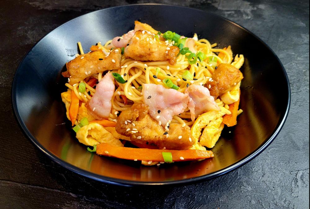 Яичная лапша, куриное филе в пикантной панировке, бекон, яйцо куриное, морковь, соус фирменный, лук зелёный, кунжут.