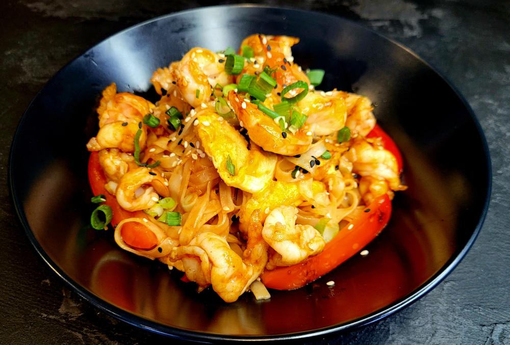 Рисовая лапша фо, креветки, перец болгарский, яйцо куриное, соус пад-тай, лук зелёный, кунжут.