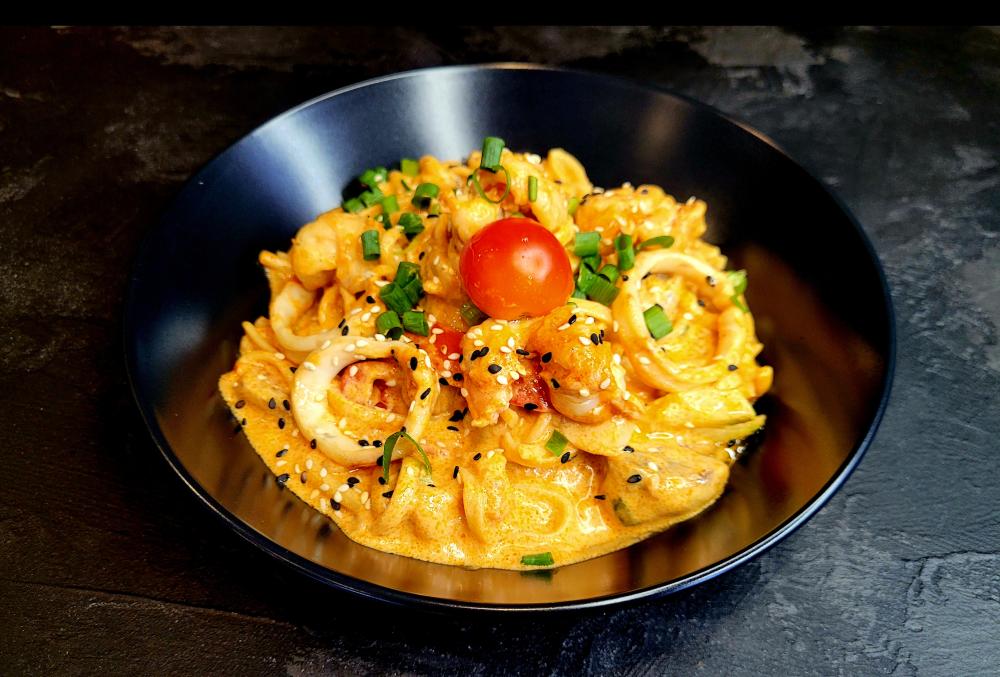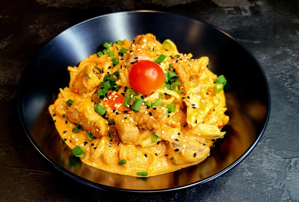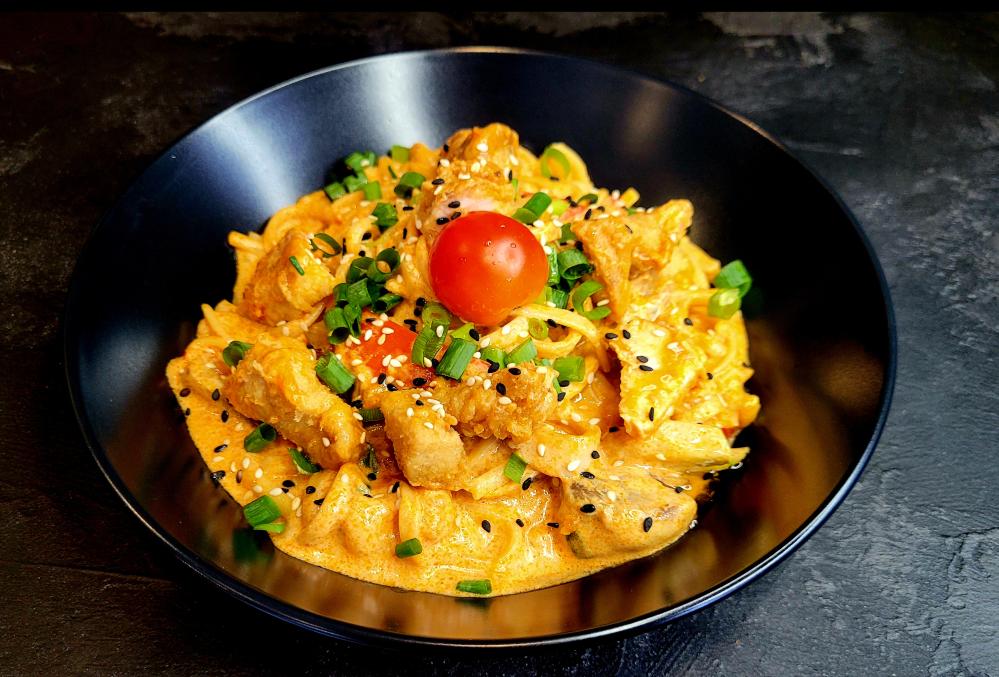 Пшеничная лапша удон, куриное филе в пикантной панировке, паста острая, сливки, перец болгарский, шампиньоны, черри, кунжут, лук зелёный.