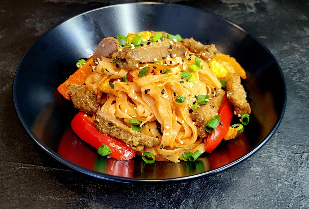 Рисовая лапша фо, говядина мякоть в пикантной панировке, перец болгарский, яйцо куриное, соус пад-тай, лук зелёный, кунжут.
