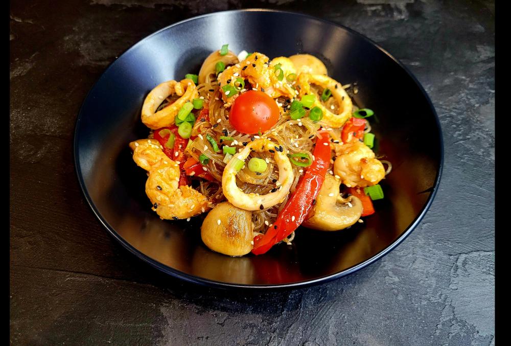 Бобовая лапша, креветки кальмар, перец болгарский, шампиньоны, соус терияки, соус фирменный, черри, лук зелёный, кунжут.