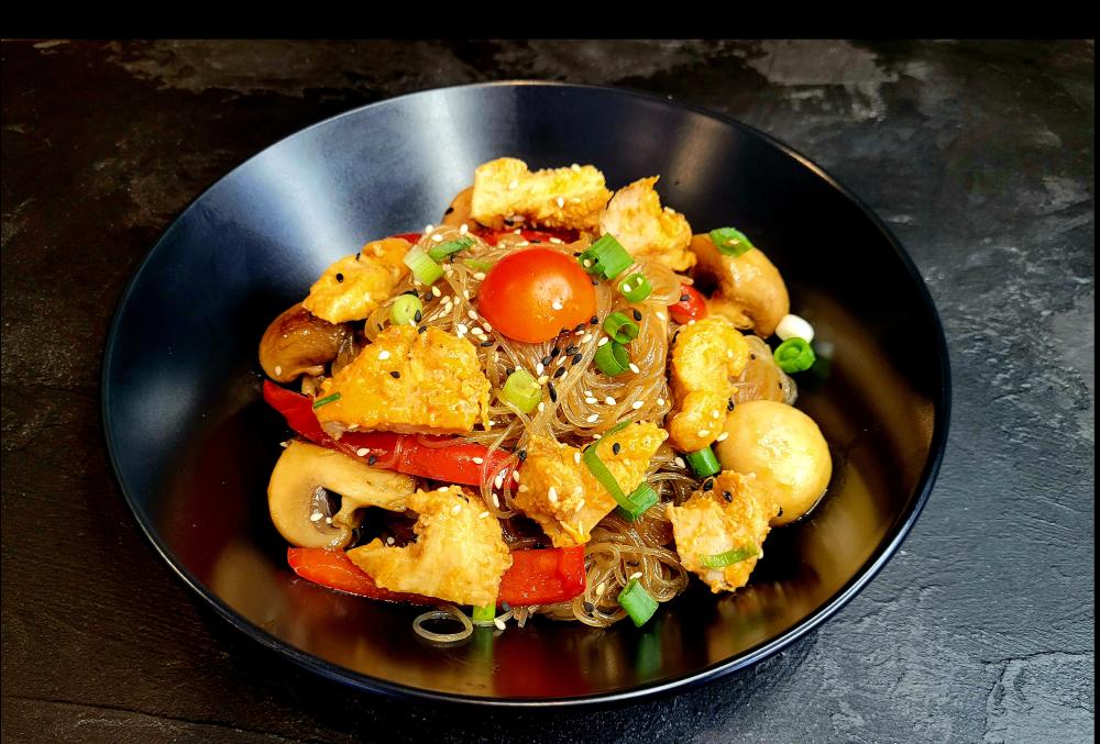 Бобовая лапша, куриное филе в пикантной панировке, перец болгарский, шампиньоны, соус терияки, соус фирменный, черри, лук зелёный, кунжут.
