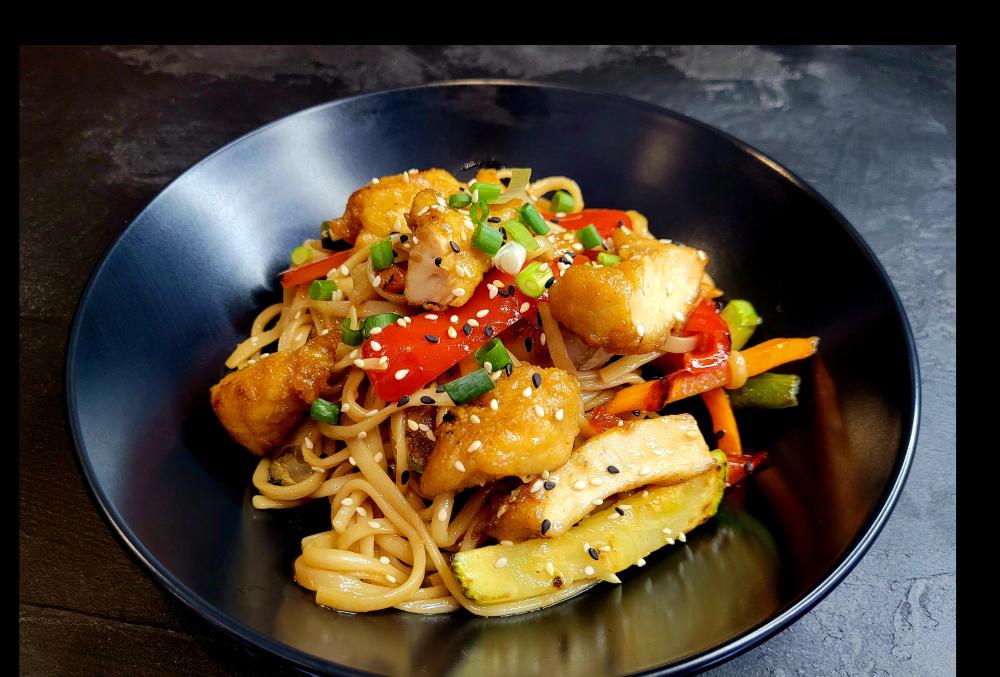Пшеничная лапша, куриное филе в пикатной панировке, фасоль зелёная, перец болгарский, цукини, морковь, капуста пекинская, соус фирменный, лук зелёный, кунжут.
