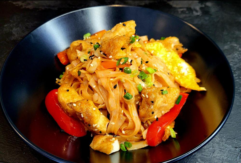 Рисовая лапша фо, куриное филе в пикантной панировке, перец болгарский, яйцо куриное, соус пад-тай, лук зелёный, кунжут.