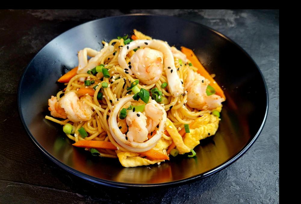 Яичная лапша, креветки кальмар, яйцо куриное, морковь, соус фирменный, лук зелёный, кунжут.