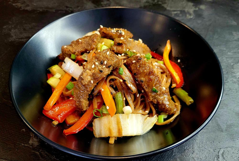 Гречневая лапша, говядина мякоть в пикатной панировке, фасоль зелёная, перец болгарский, цукини, морковь, капуста пекинская, соус фирменный, лук зелёный, кунжут.