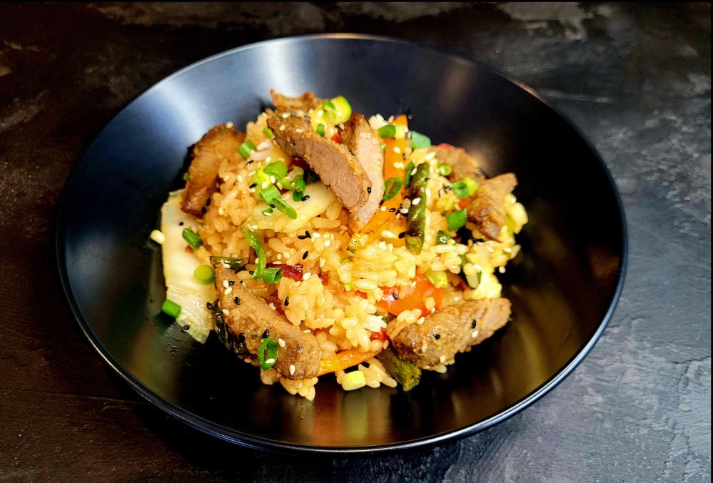 Рис, говядина мякоть в пикантной панировке, перец болгарский, цукини, морковь, фасоль зелёная, капуста пекинская, соус фирменный, лук зелёный, кунжут.