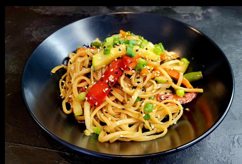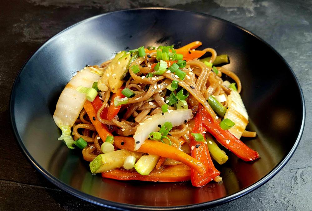 Гречневая лапша, фасоль зелёная, перец болгарский, цукини, морковь, капуста пекинская, соус фирменный, лук зелёный, кунжут.