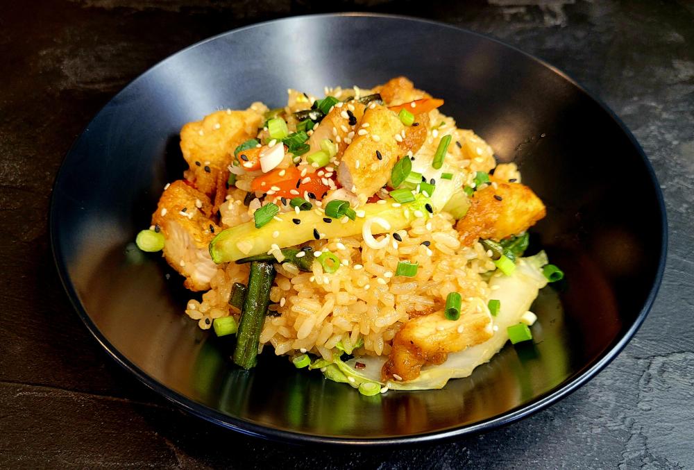 Рис, филе куриное в пикатной панировке, перец болгарский, цукини, морковь, фасоль зелёная, капуста пекинская, соус фирменный, лук зелёный, кунжут.