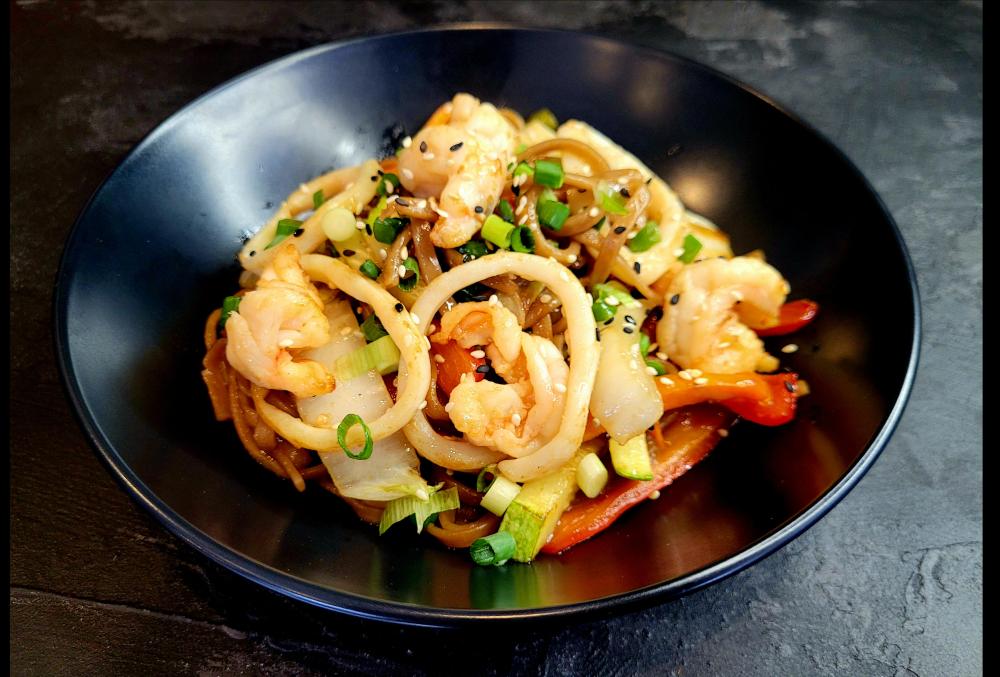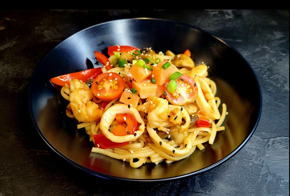 Пшеничная лапша удон, креветки, кальмар, лосось, перец болгарский, шампиньоны, цукини, соус фирменный, черри, лук зелёный, кунжут.
