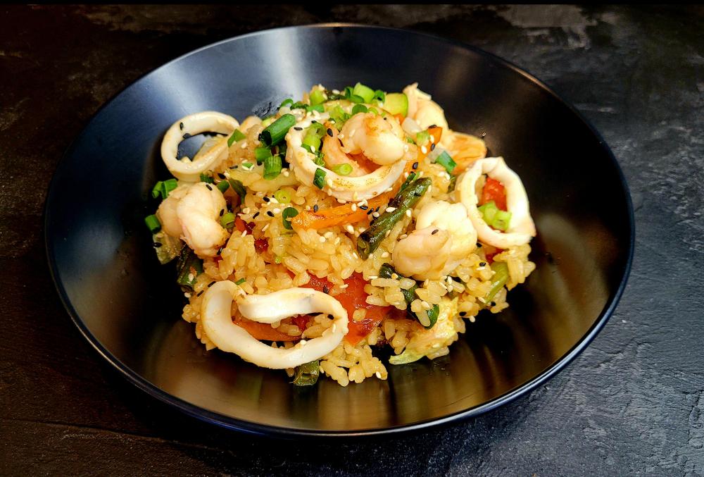 Рис, креветки, кальмар, перец болгарский, цукини, морковь, фасоль зелёная, капуста пекинская, соус фирменный, лук зелёный, кунжут.