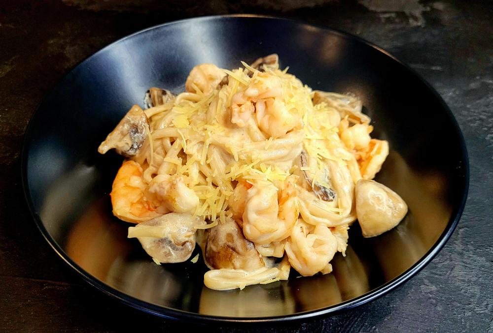 Пшеничная лапша удон, креветки, шампиньоны, соус устречный , сливки, пармезан