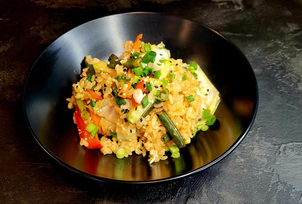 Рис,перец болгарский, цукини, морковь, фасоль зелёная, капуста пекинская, соус фирменный, лук зелёный, кунжут.