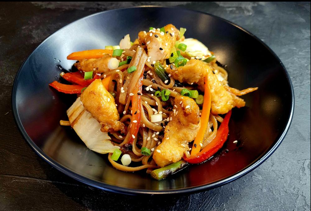 Гречневая лапша, куриное филе в пикатной панировке, фасоль зелёная, перец болгарский, цукини, морковь, капуста пекинская, соус фирменный, лук зелёный, кунжут.