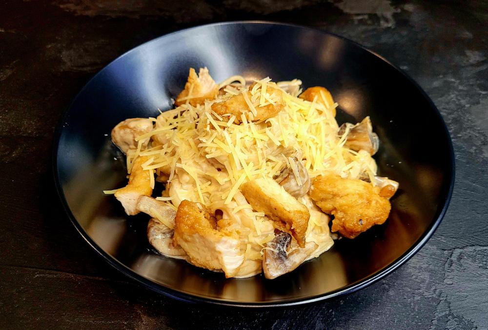 Пшеничная лапша удон, куриное филе в пикатной панировке, шампиньоны, соус соевый, сливки, пармезан