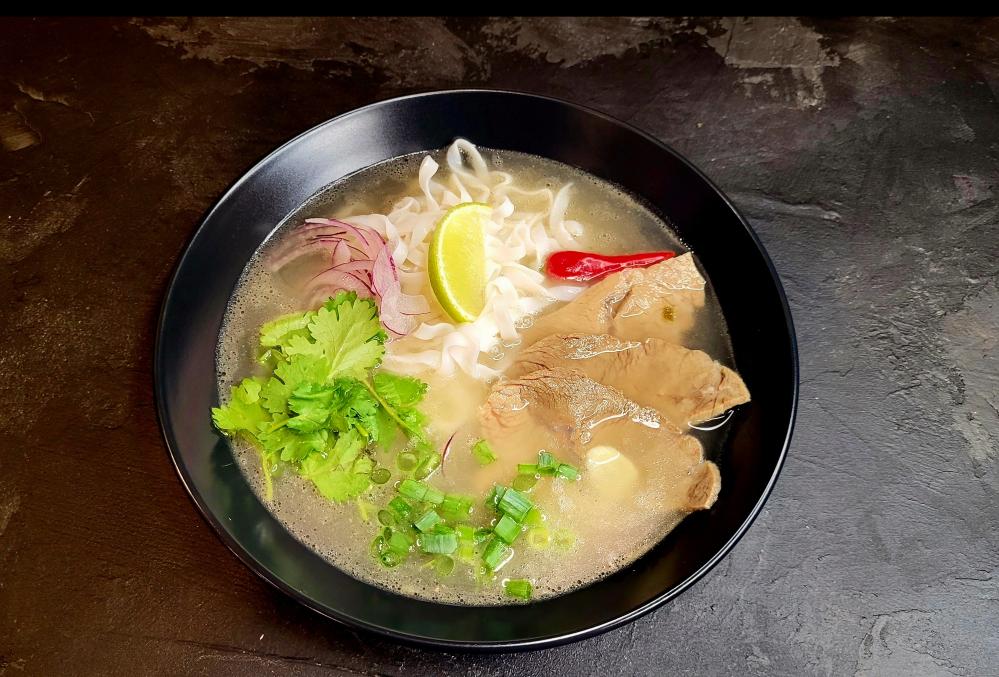 Бульон говяжий, говядина, рисовая лапша фо, специи, кинза, лук зелёный, перец острый, чеснок, уксус рисовый, лук красный, лайм, соус острый кимчи.