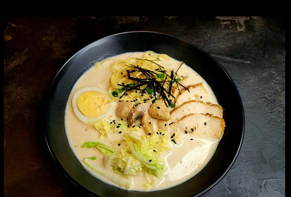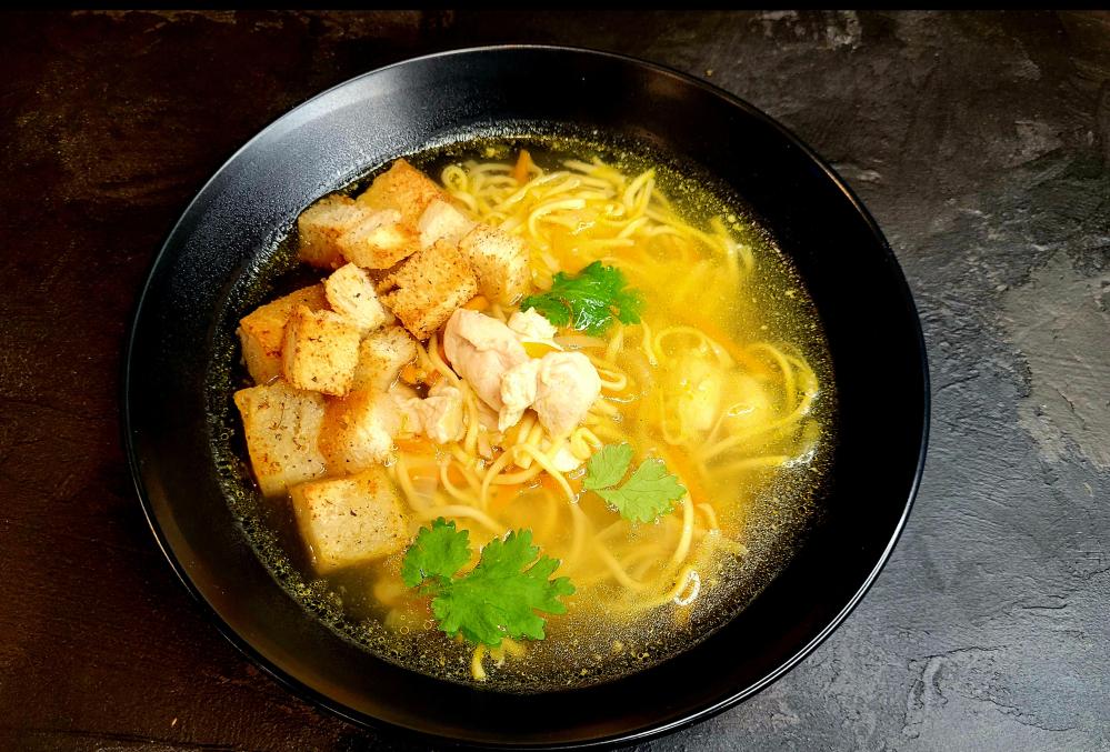 Бульон куриный, сливки, лапша яичная, яйцо куриное, капуста пекинская, соус соевый, специи, филе куриное, шампиньоны, лук зелёный, кунжут.