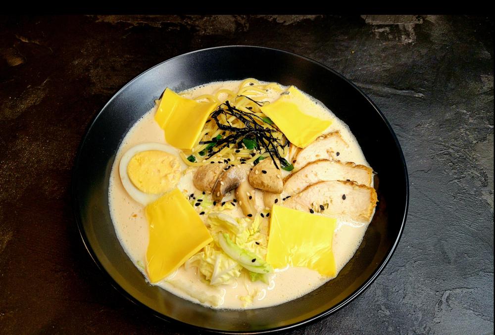Бульон куриный, сыр плавленый,сыр чеддер, лапша яичная, яйцо куриное, капуста пекинская, соус соевый, специи, филе куриное, шампиньоны, лук зелёный, кунжут.