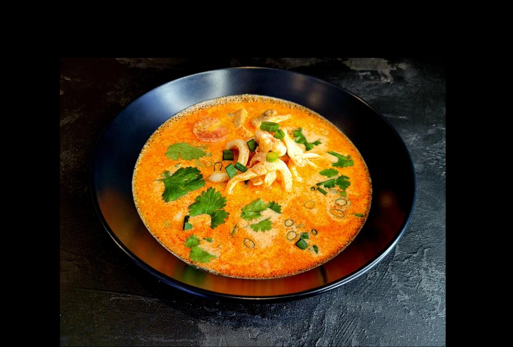 Бульон, креветки, кальмар, шампиньоны, паста острая, сливки, кокосовое молоко, имбирь, чери, кинза, лук зелёный, рис.