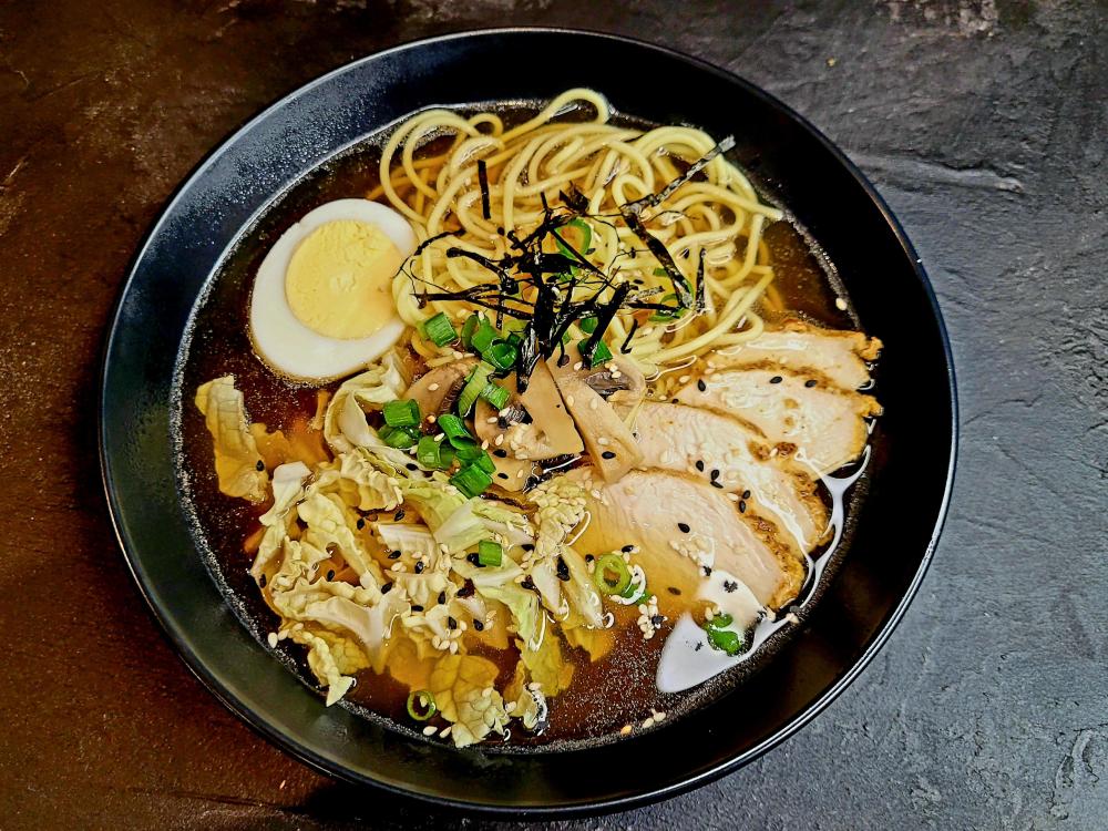 Бульон куриный, лапша яичная, яйцо куриное, капуста пекинская, соус соевый, специи, филе куриное, шампиньоны, лук зелёный, кунжут.