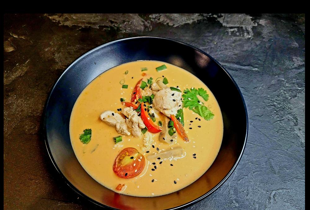 Бульон, филе куриное, перец болгарский, шампиньоны, чери, паста острая, имбирь, сливки, кокосовое молоко, кинза, лук зелёный, кунжут, рис.