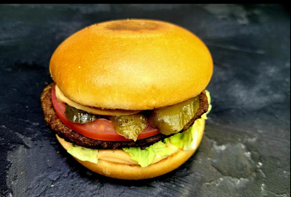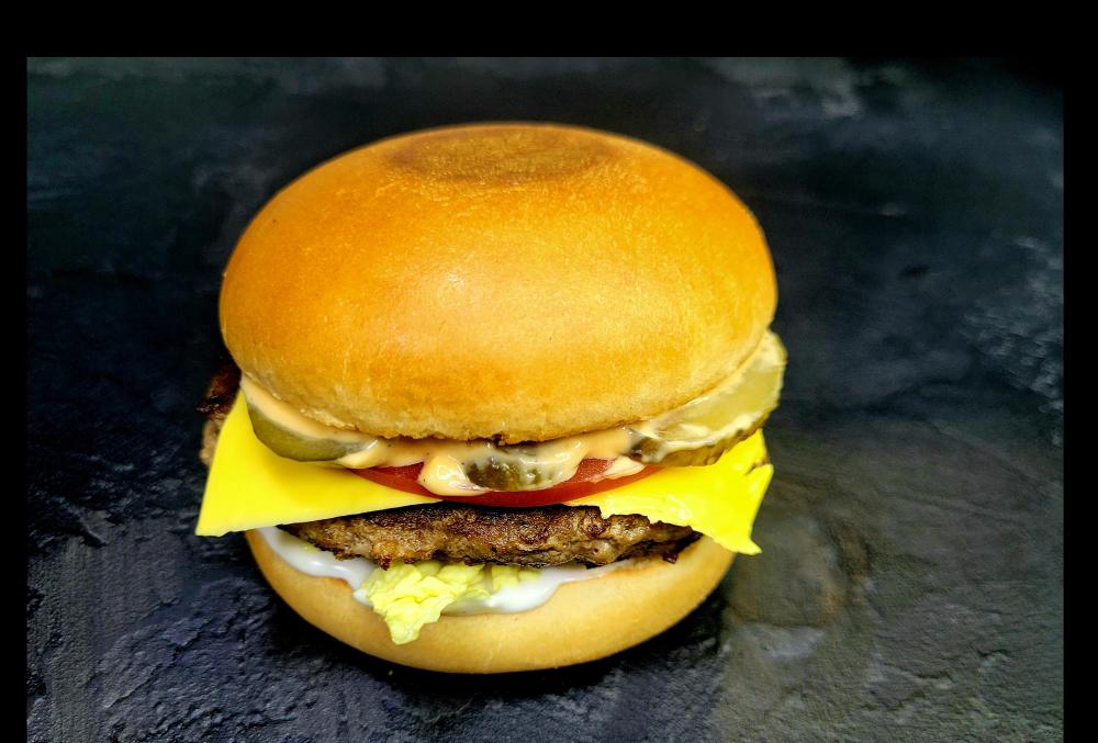 Булочка бриошь,котлета говяжья,помидор,огурчики соленые,сыр чеддер,соус гриль,соус,белый,капуста пекинская.
