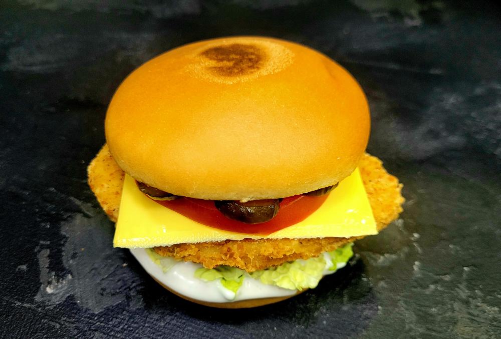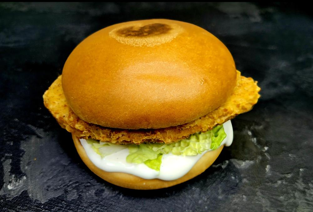 Булочка бриошь, котлета куриная в хрустящей панировке , огурцы маринованные, помидор, чеддер, капуста пекинская, соус белый, соус гриль