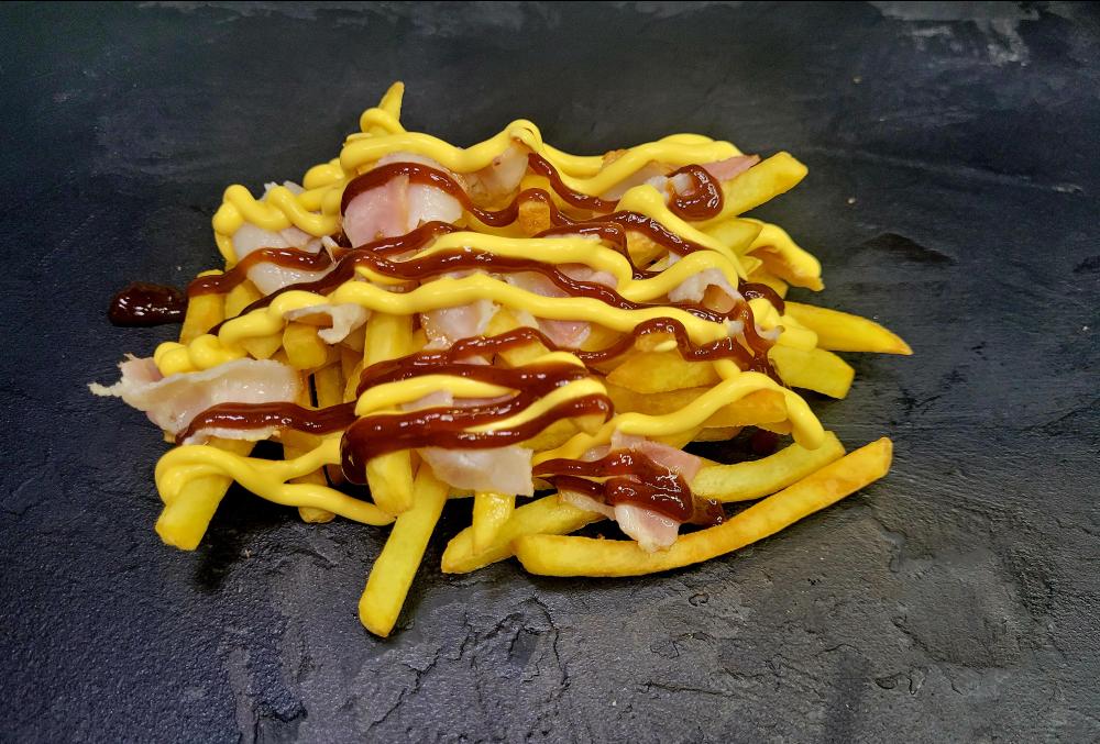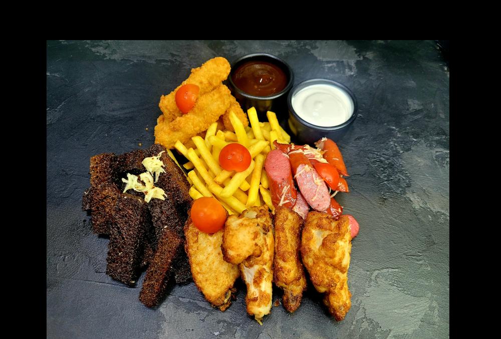 Картофель фри,гренки ржаные,сырные палочки,колбаски охотничьи,крылья куриные,соус белый,соус барбекю,помидоры черри.