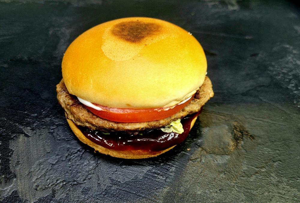Булочка бриошь, котлета говяжья,помидор,капуста пекинская,соус барбекю,соус белый.
