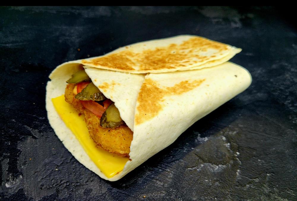 Торилья пшеничная,котлета куриная в хрустящей панировке,помидор,огурчики солёные,сыр чеддер,соус гриль,соус белый.