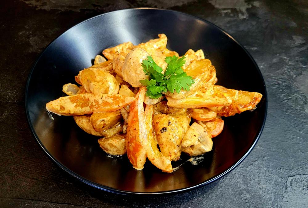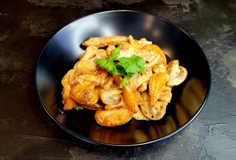 Куриное филе, перец болгарский, шампиньоны, лук репчатый, картофель, сливки.