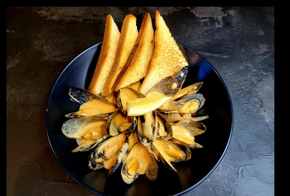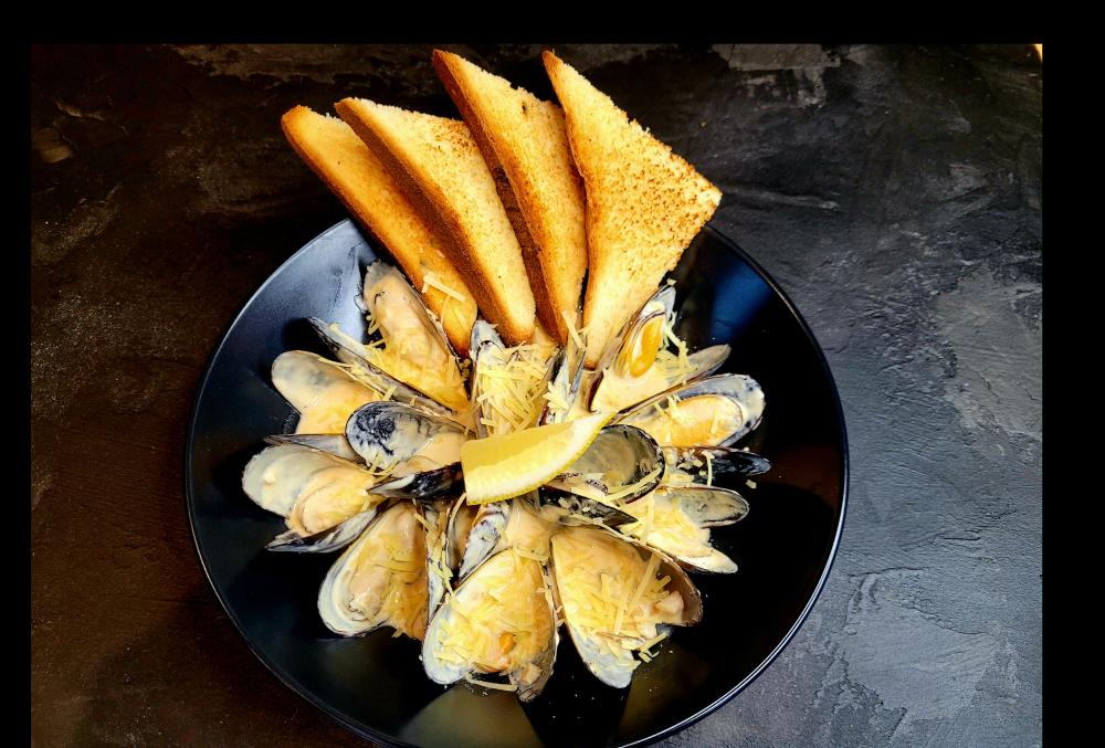 Мидии 15шт, сливки, соус устричный, пармезан, гренки.