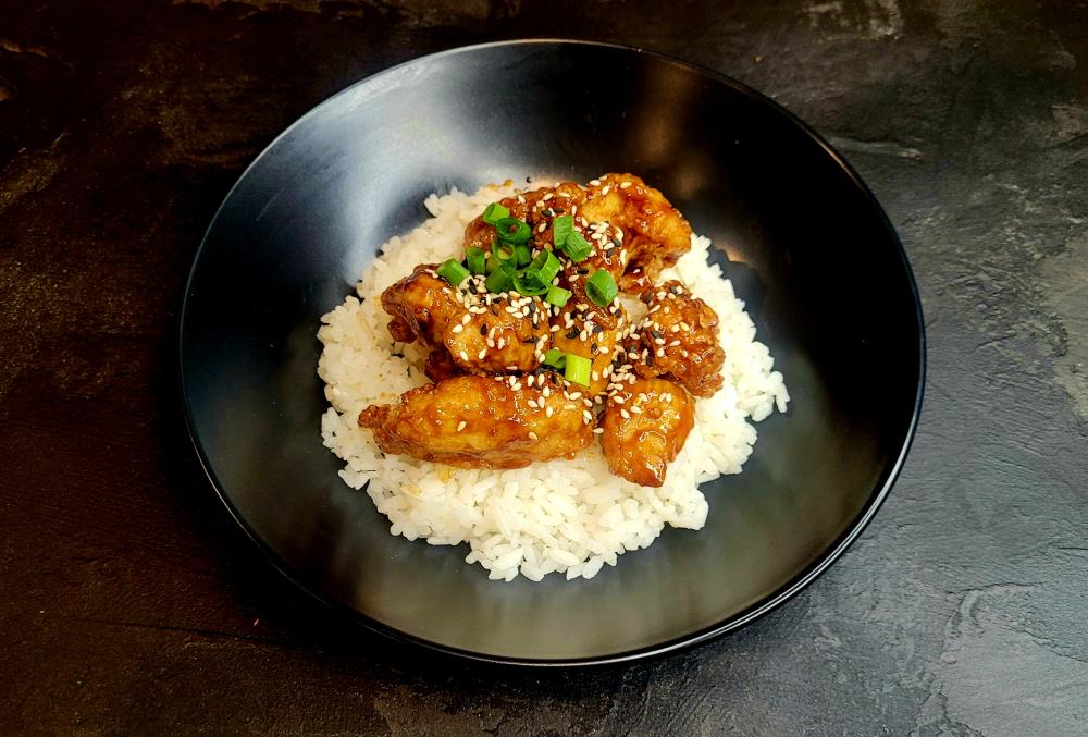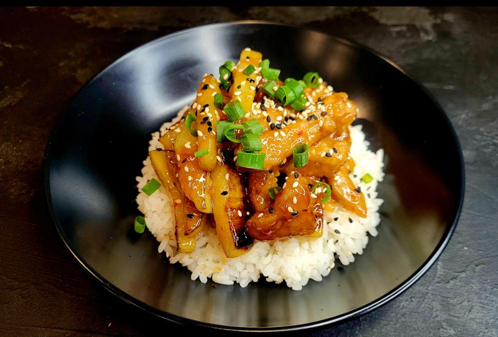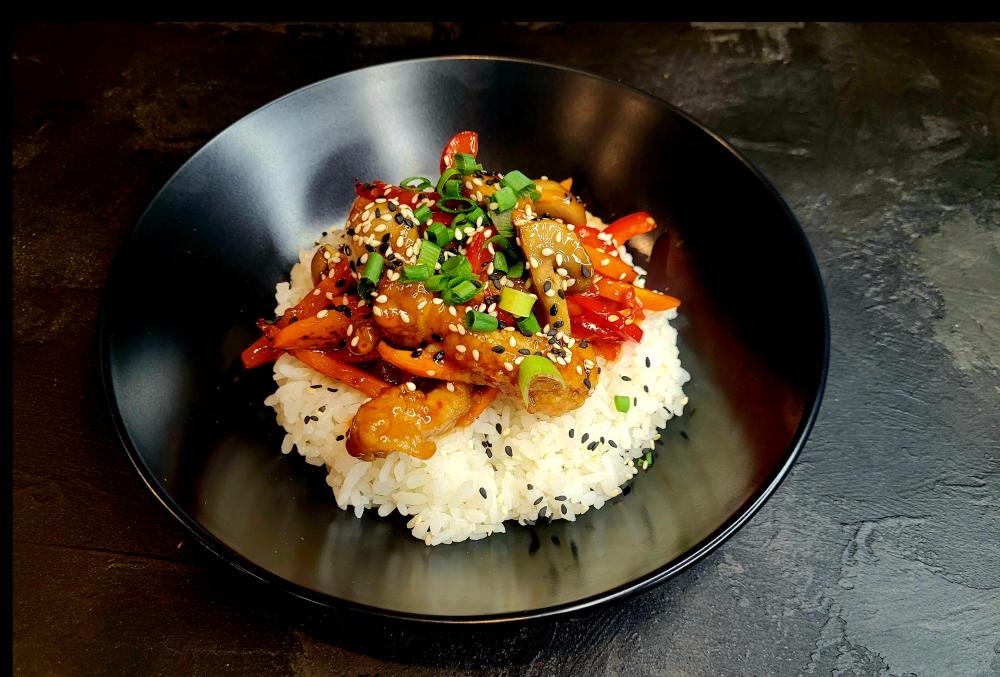 Свинина в пикатной панировке,баклажаны,соус остро-сладкий,лук зел,кунжут,рис.
