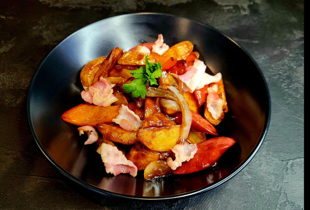 Колбаски, куриное филе, бекон, перец болгарский, шампиньоны, лук репчатый, картофель соус барбекю.