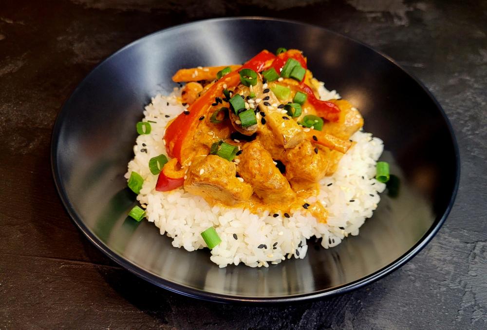 Филе куриное в пикатной панировке, фасоль зелёная, перец болгарский, морковь ,шампиньоны, паста острая, сливки, имбирь, рис.