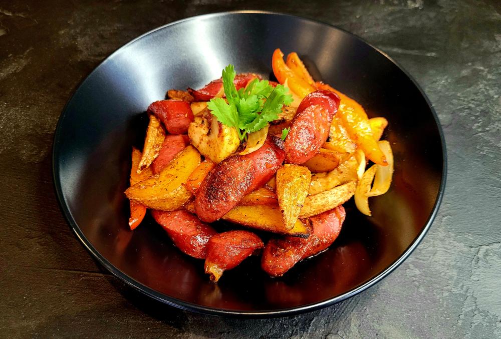 Колбаски охотничьи, специи, перец болгарский, шампиньоны, лук репчатый, картофель.