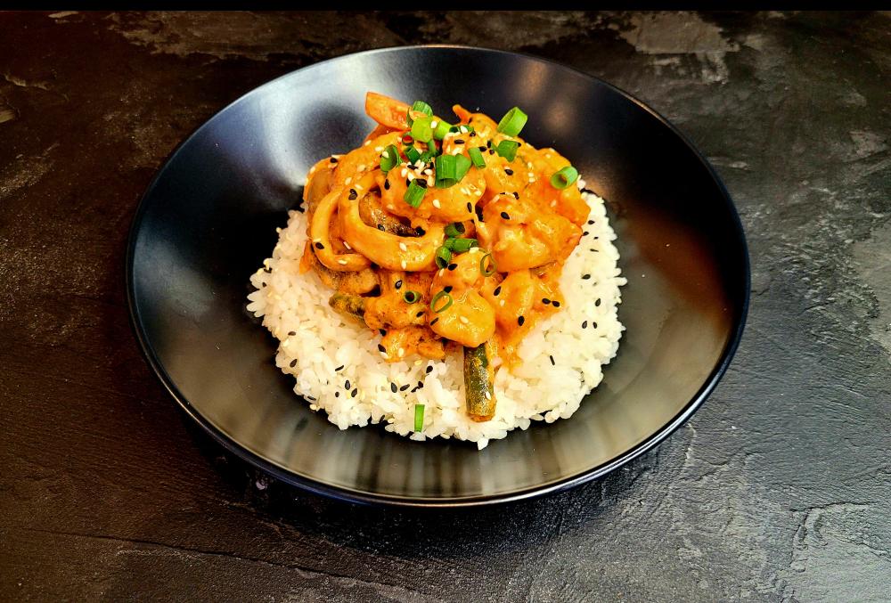 Креветки кальмар, фасоль зелёная, перец болгарский, морковь ,шампиньоны, паста острая, сливки, имбирь, рис.