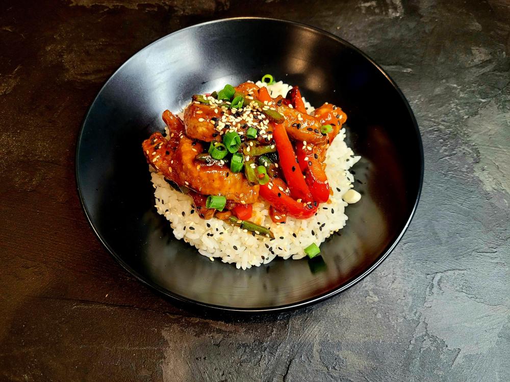Свинина в пикатной панировке,фасоль зелёная, перец болгарский,соус кимчи,лук зел,кунжут,рис.