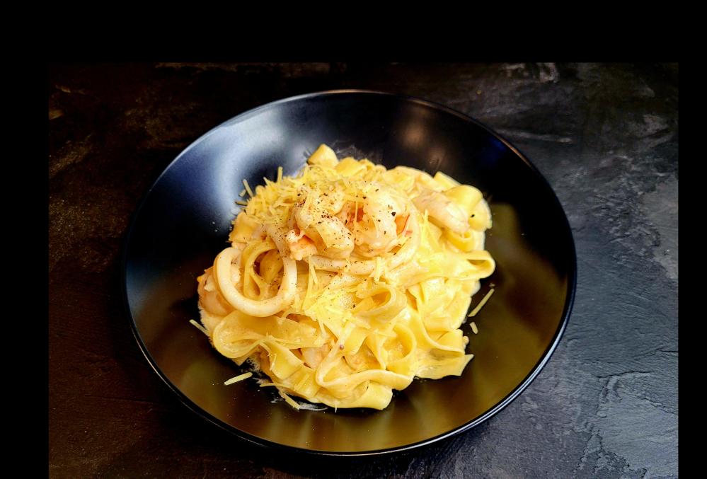 Креветки, кальмар,сливки, горчица дижонская, соус кимчи, пармезан, перец чёрный молотый.