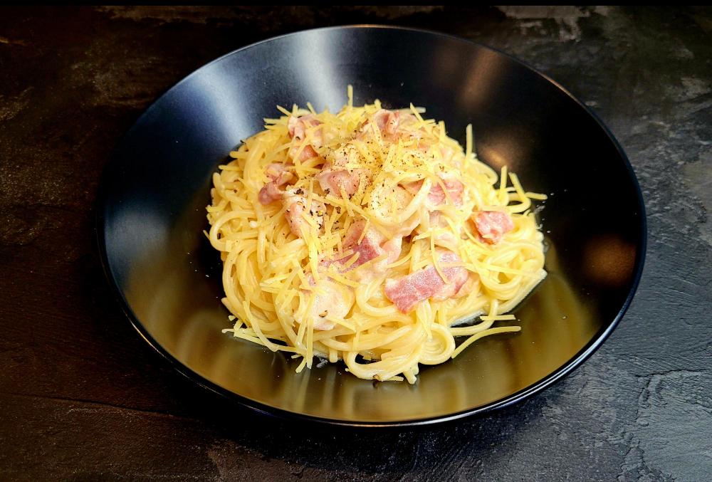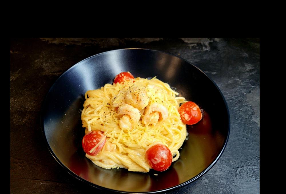 Креветки, черри, сливки, соус кимчи, пармезан, перец чёрный молотый.