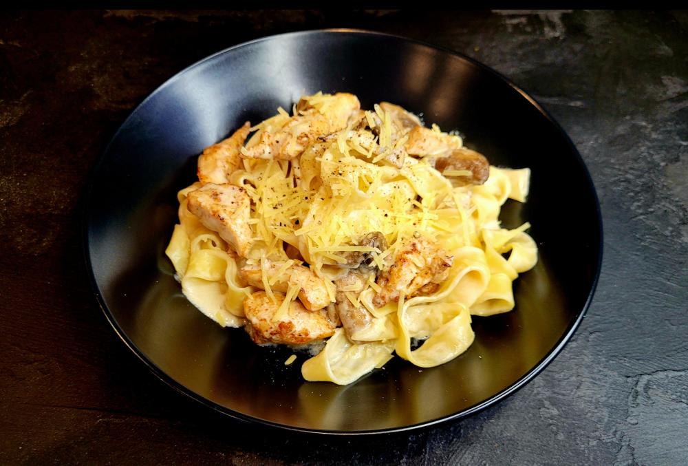 Куриное филе, шампиньоны, сливки, пармезан перец чёрный молотый.